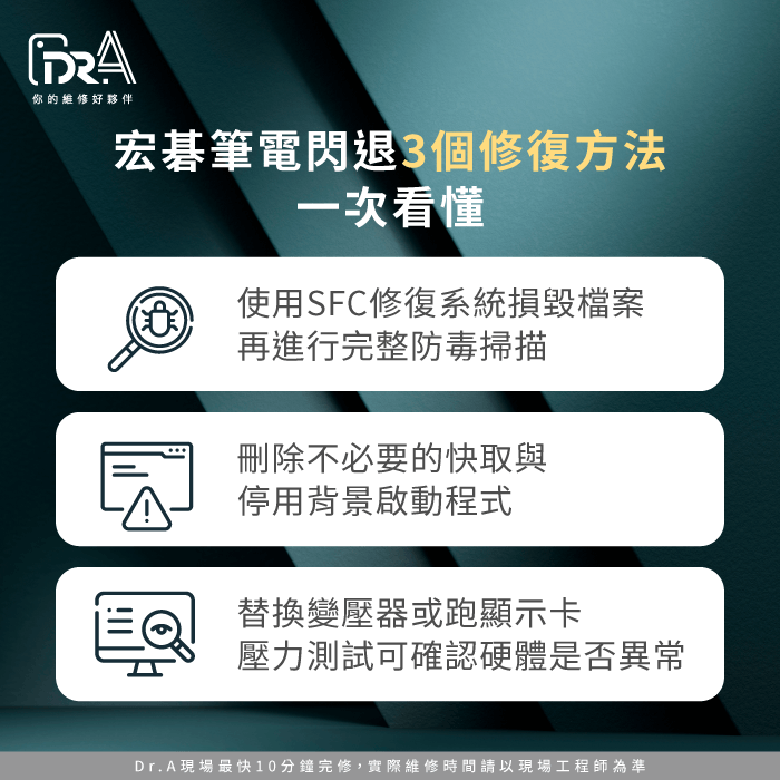 了解導致Acer筆電閃退的原因後,那麼該如何解決呢?接下來Dr.A提供3個排解方法,讓各位在家也能嘗試修復這些常見問題。從系統掃描、資源釋放,到硬體穩定性檢查,就有機會找出並排除異常根源,現在就一起往下繼續了解吧!