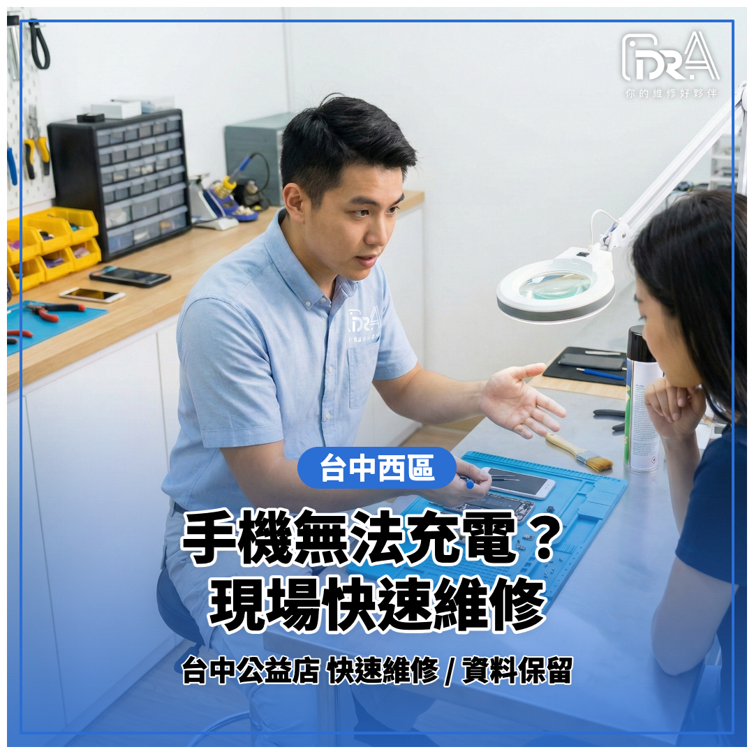 台中西區手機無法充電選Dr.A,結合18年維修經驗、專業設備、透明報價與完整保固。無論您是在NOVA找3C配件,還是在勤美綠園道散步,遇到手機充電問題都能就近尋求協助。我們在公益路雙據點(公益店、勤美店)隨時準備為您服務。選擇Dr.A,選擇安心、專業與效率,讓智慧生活不再中斷。